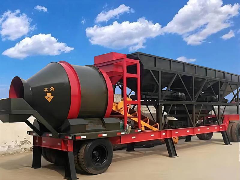 Мобильный барабанный бетоносмесительный завод YHZM25 оснащен барабанным бетоносмесителем JZM500, дозировочная машина оснащена дозатором PLD800, теоретическая производительность составляет 25 кубических метров в час.